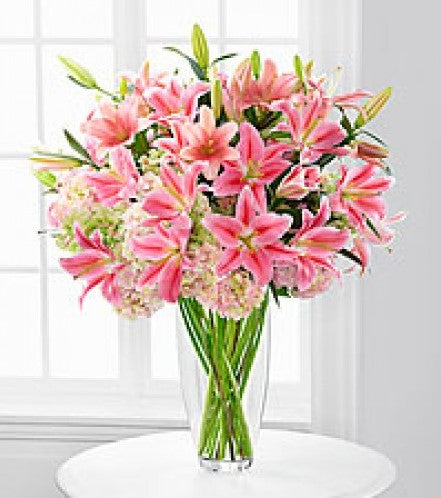 A captivating display of elegance and grace. The arrangement features a delightful assortment of fresh, pink lilies, exuding a soft and gentle charm. Each lily blossom unfolds its velvety petals, creating a mesmerizing sight and filling the air with a sweet, floral fragrance. The artful design is complemented by lush greenery, adding a touch of natural beauty and enhancing the overall allure. Perfect for expressing love, appreciation, or sending warm wishes on any occasion, this Pink Lilies Floral Arrangement is sure to leave a lasting impression of beauty and sophistication.
