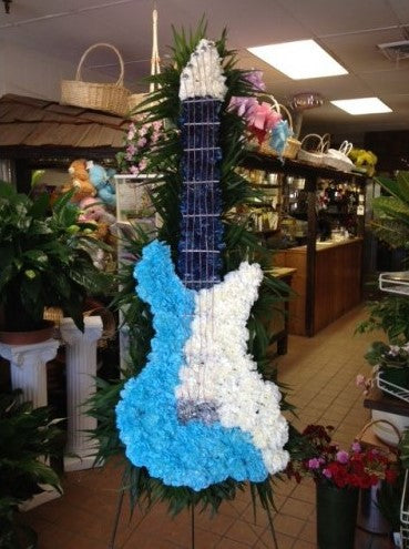 Presenting our captivating Blue and White Guitar Standing Spray, a unique and heartfelt tribute to honor the memory of a music-loving soul. This extraordinary arrangement beautifully combines delicate blue and pristine white flowers, expertly arranged in the shape of a guitar. The symbolic design embodies the harmony and joy that music brought to their life. The elegant flowers and lush greenery create a striking contrast, paying homage to their passion and artistic spirit. Perfect for a musician's memorial service or as a meaningful gift for their loved ones, this standing spray conveys profound emotions and memories that will resonate for years to come.
