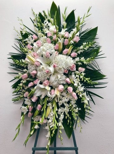 Blissful Petal Harmony Standing Spray, a breathtaking tribute that combines the timeless beauty of white peonies, the delicate charm of pink roses, and the elegance of white snapdragons. Standing tall on a graceful easel, this arrangement is a celebration of serenity and enduring love. The lush white peonies exude a sense of purity and grace, while the pink roses symbolize admiration and appreciation. The white snapdragons add a touch of sophistication and unity to this exquisite ensemble. The Blissful Petal Harmony Standing Spray is more than a display; it's a heartfelt expression of sympathy and a vivid celebration of a life filled with beauty, love, and cherished moments.