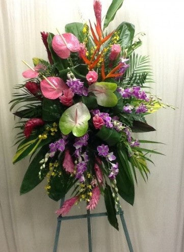 Crafted with expertise and scientific precision, Tropical Harmony Radiance Standing Spray is a captivating tribute. It intertwines the lush beauty of pink and green laceleaf, the exotic allure of orange bird of paradise, the regal elegance of purple orchids, and a vibrant array of green accents. This arrangement is a heartfelt expression of sympathy, a celebration of life's vibrancy, and a tribute to the stunning tropical scenery.