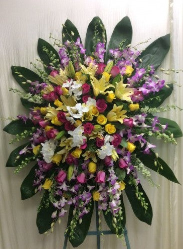 Experience the beauty of nature with this product, featuring lush green leaves and vibrant flowers. Ideal for adding a pop of color to any setting as a standing spray.
