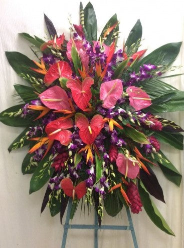 Enhance the appearance of a dignified standing spray and a prominent leaf, accented with a dash of red and stunning flowers.