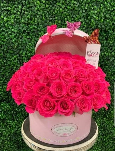 A beautiful oasis with this elegant display of vibrant hot pink roses, beautifully arranged in a luxurious pink box adorned with delicate butterfly decorations.
