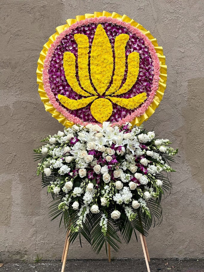 This lotus flower standing spray is a truly beautiful and serene addition to any funeral or memorial service. Its elegant design and delicate petals represent the purity and rebirth of the soul. Expertly crafted, this spray is a comforting and meaningful tribute to honor the departed.