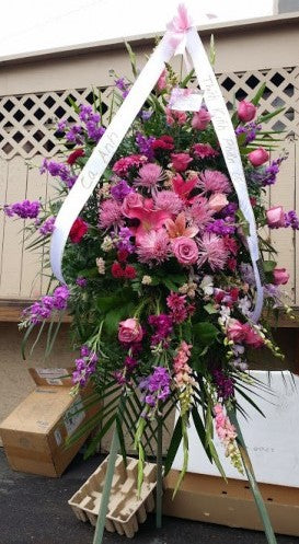 This standing spray features a beautiful combination of pink and purple flowers, making it a stunning display for any funeral or memorial service. The soft colors bring a sense of comfort and peace to the occasion, honoring the memory of your loved one.