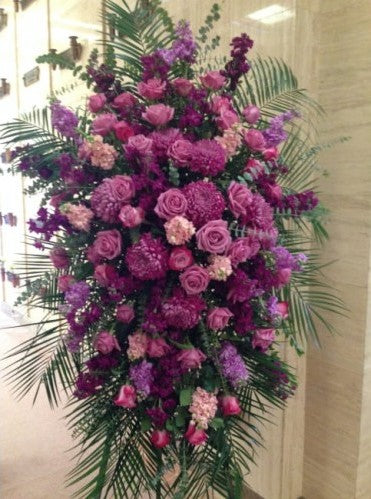 This arrangement boasts a balance of vibrant flowers and verdant foliage. Its alluring mix of purple blooms is thoughtfully chosen for their graceful beauty and sophistication. The standing spray offers a calming and comforting presence, making it a touching tribute for any memorial or remembrance event.