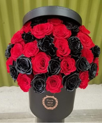Expertly crafted with stunning red and black roses. This beautiful arrangement is elegantly presented in a box, making it the perfect gift for any occasion.
