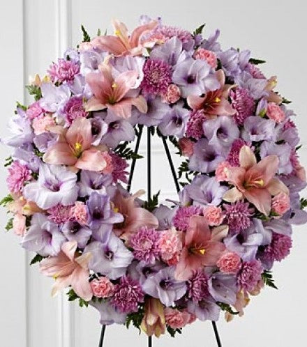 The wreath features an elegant arrangement of beautiful pastel colors.