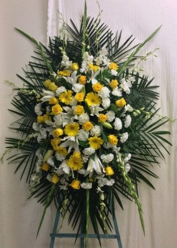A radiant and serene tribute that celebrates the beauty of life. This exquisite arrangement features a harmonious blend of bright yellow and pristine white roses, delicate carnations, serene lilies, and charming daisies. Standing tall on an elegant easel, a perfect way to honor the life and spirit of your beloved.