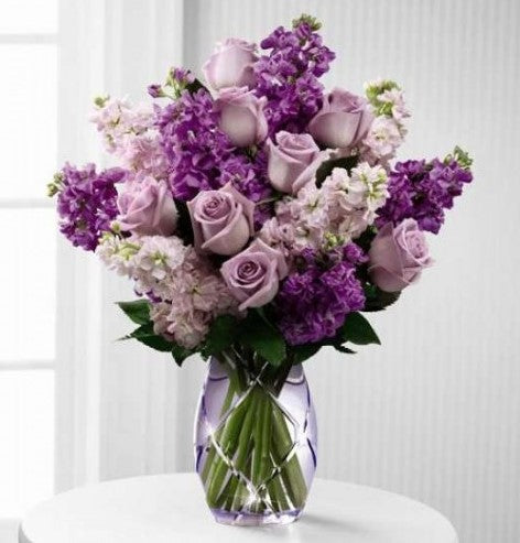 The included arrangement features a stunning combination of purple roses and lavender, accompanied by striking purple stock all displayed in a beautiful vase.