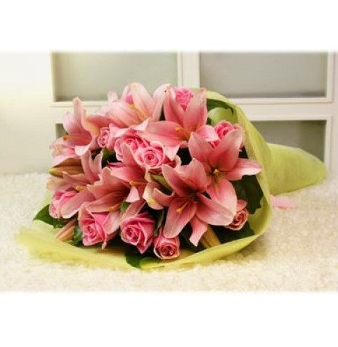 This elegant bouquet features a combination of 12 pink roses and 6 pink lilies, expertly arranged and wrapped for a stunning presentation.