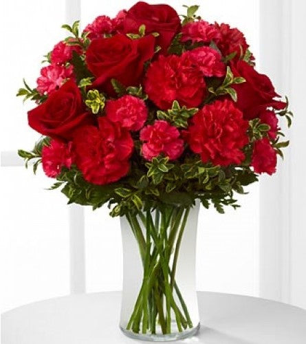 Stunning blend of red carnations and red roses, arranged in a clear vase to showcase their beauty.