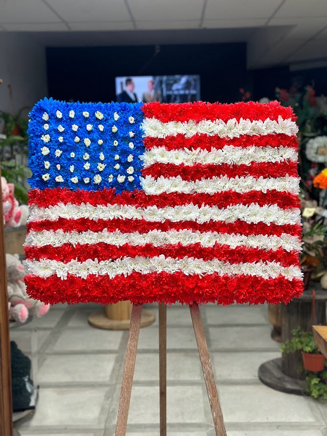 This United States Flag Funeral Spray is adorned with vibrant red, white, and blue flowers, serving as a beautiful tribute to the country. Honor your loved one with this patriotic display, representing their pride and love for their country.