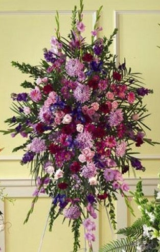 The blend of vibrant violet and delicate pink hues adds a touch of elegance to the occasion. Pay homage to your loved one with this precious and beautiful display.
