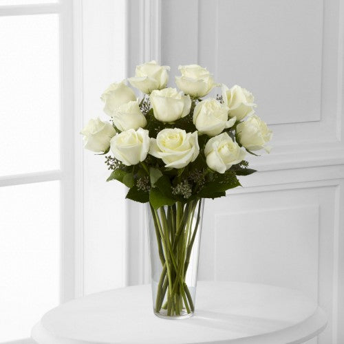Expertly crafted, these elegant white roses in a clear vase bring a touch of sophistication to any space. With their delicate blooms and sleek vessel.