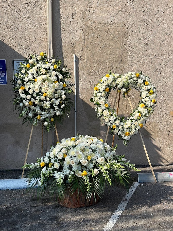 This set includes a heart-shaped standing spray, a standing spray, and a casket adorned with white and yellow flowers for a dignified and heartfelt funeral tribute.
