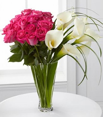 Stunning hot pink roses paired with elegant cala lilies in a crystal clear vase. This unique combination is sure to make an unforgettable impression. Delivered with care and ready to brighten someone's day.
